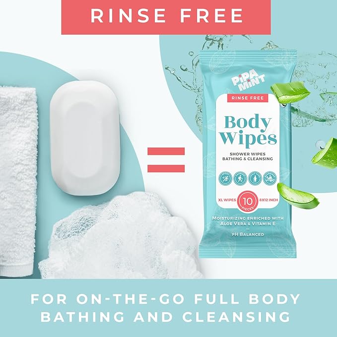 - Portable - Easy to carry: quick cleaning with PIPA MINT wet wipes for adults you will feel all fresh again. No need to feel bad or afraid to sweat, a super easy solution in the exact size for your convenience: non-sticky residue after use. Full Body wipes is A MUST HAVE in your purse or bag - Rinse Free No Water, shower wipes anytime, anywhere: Camping, Travel, Gym, After Workout.