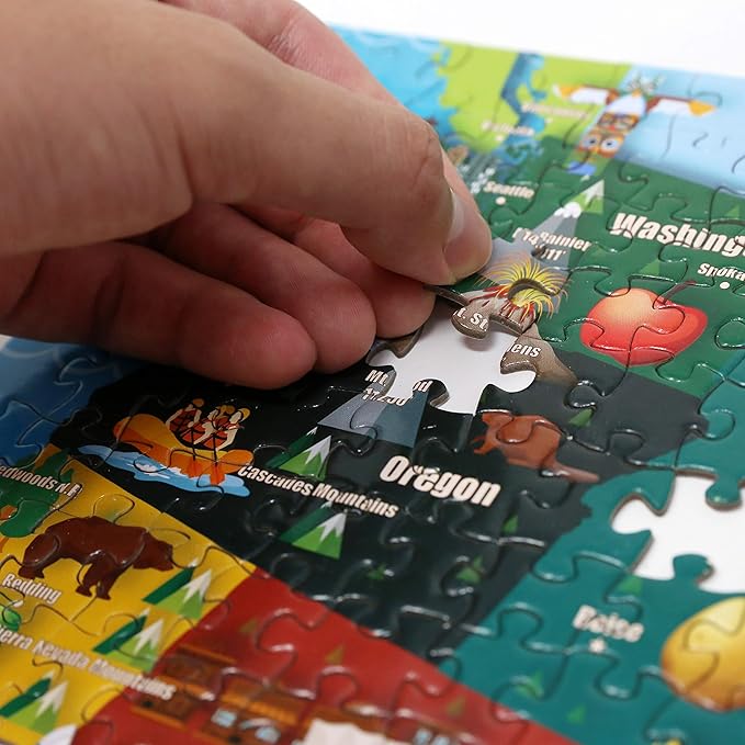 - 【USA Map】 - Great colorful puzzle to stimulate interests in the geography of America and National Parks. Each state is uniquely colored and decorated. Students can learn about the geography of the USA including the mountain ranges & lakes. Important landmarks and tourist sights such as Yosemite, Grand Canyon, Yellowstone, Mount Rushmore and Statue of Liberty are nicely depicted. State Capitals and important cities and activities & shown as well. Fun way to learn & memorize all the states and their capitals.