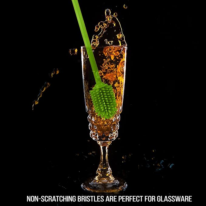 - NO SCRATCHES: Soft yet durable silicone bristles of our water bottle cleaner and long straw cleaner brush remove stubborn residue without scratching glass, stainless steel, or plastic. Ideal for glass water bottles, vases, baby bottles, pitchers, blenders and reusable straws.