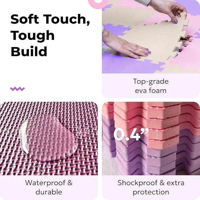 • 🧐 NON-TOXIC, SOFT & WATERPROOF PLAY MAT: Made from certified and durable EVA foam, this floor mat is 0.4 inches thick for comfort and safety. Our foam interlocking tiles has a waterproof surface and wipes clean easily, keeping your child’s play area hygienic and ready for daily use. Enjoy as play mat for babies 6-12 months. Use as tapete para bebes.