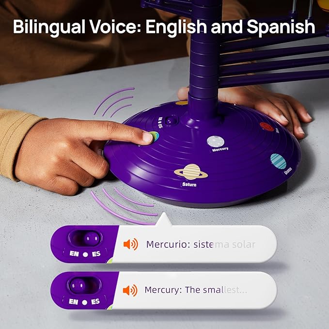 - TALKING SOLAR SYSTEM MODEL: Our educational toy includes both English and Spanish options, easy to switch. Children can press the planet pattern on the base to get interesting educational facts about astronomy and help them expand their knowledge of the solar system. It’s easy to use and fun to learn, making it a real educational toy for kids aged 5-7