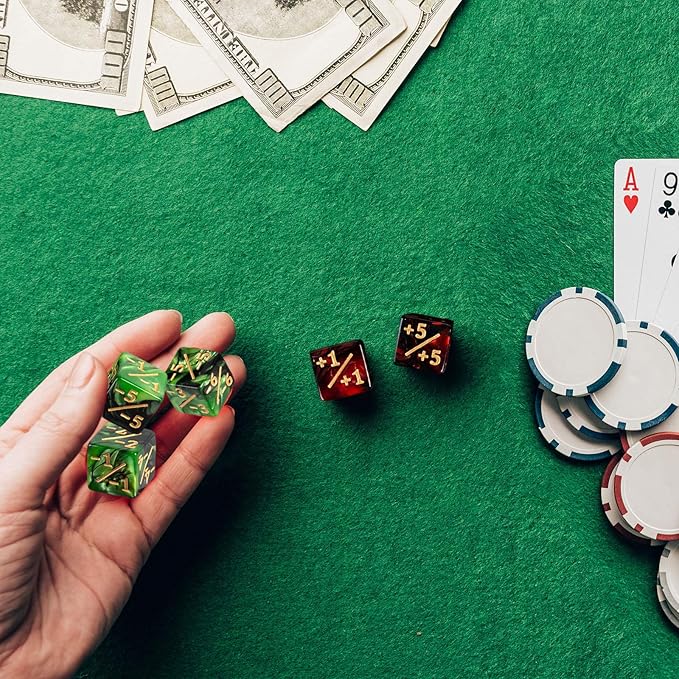 - What You Will Get: Total 24 pieces dice counters with flannelette bag. Includes 12 pieces +1~+6 ruby dice counters & 12 pieces -1~-6 emerald dice counters. They are 0.63 inch/ 16 mm regular D6 dice.