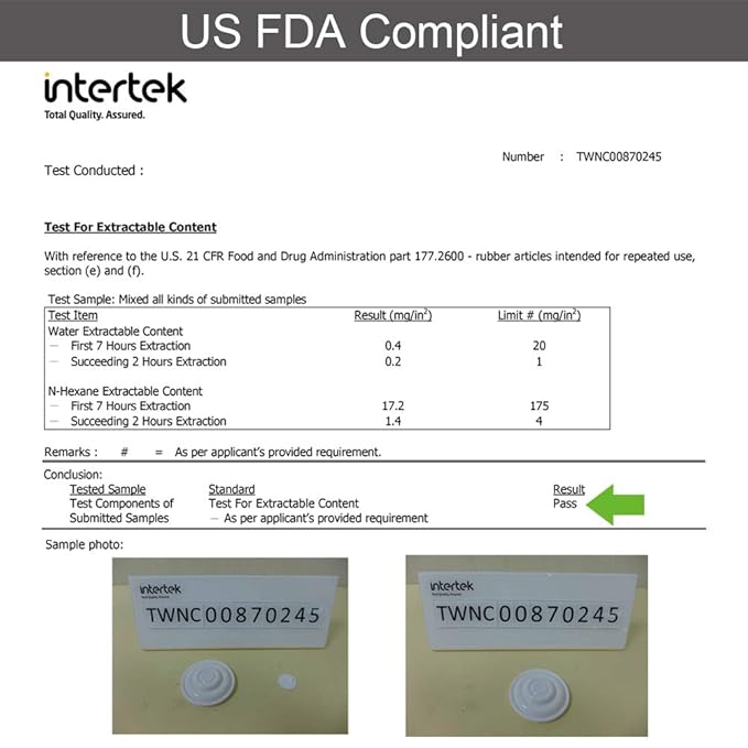 - t.US FDA Registered Medical Device (No. D192499), Health Canada License (No.26003), Australian Health and Aged Care (ID 463470). Inspected by US FDA. Comply with FDA/EU regulations for plastic materials that contact food. Test reports are conducted by independent lab and available online for reference.