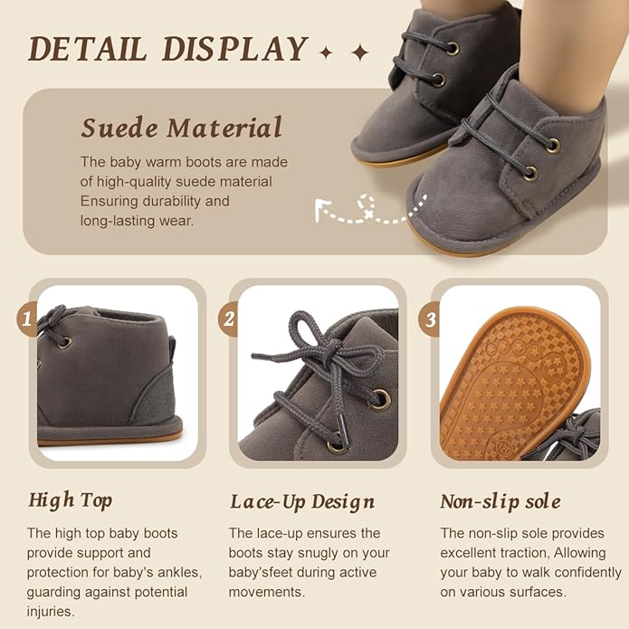 - Easy Wear: Designed specifically for baby, our cute baby boots are easy to put on and take off, ensuring a secure fit that won't easily slip off with active movements. The convenient shoe lace design offer a good fit, safeguarding every step