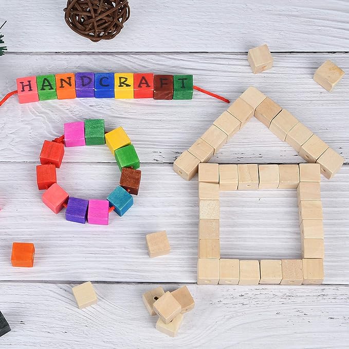 Supkiir Wood Craft Cubes - 100 Pack 1/2" Cubes with Holes, Unfinished Solid Beads Blocks for DIY Projects