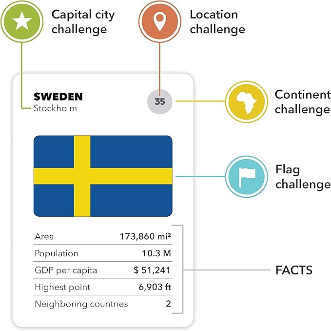 - Flags, Capitals & Location - Show the country on the map, recognize the flag or name the capital city. Cards hold over 1500 country facts.
