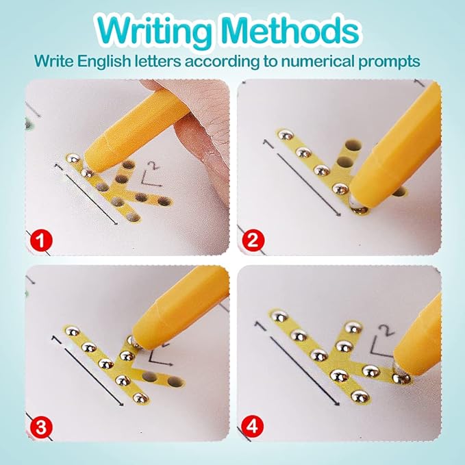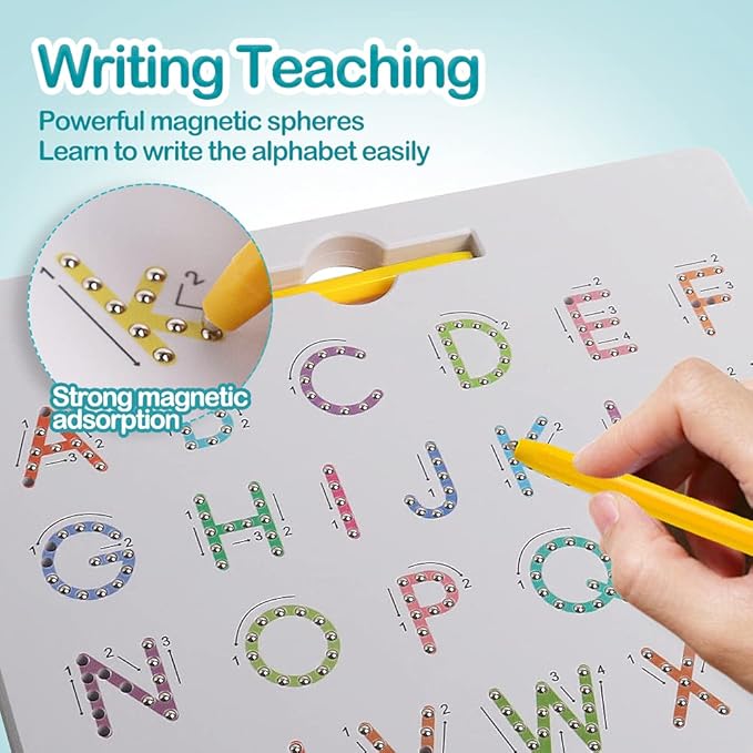 - Great Toys To Learn Writing:The Letter Tracing Board is a great toys for kids to learn how to use pen and guide children to write the letter with the correct strokes.The board can be reset and start over again.Children can use this magnetic stylus to attract the beads pop up.Kids can use their finger or other side of the pen to erase letters easily.Or they can just gently shake the board to restart.Grasping the pen to write, tracing with their fingers also can practice kids’ fine motor skills!