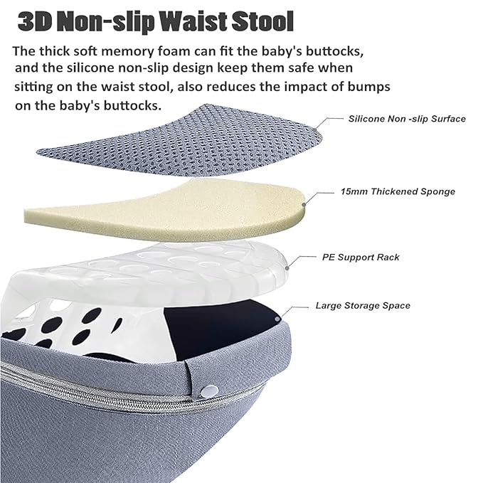 - Ergonomic Hip Seat: The waist stool maintains the baby's M-shape during carrying, helping their skeletal development. The wide waistband make the hip seat to fit snugly against the parent's waist, helping to share the weight during carrying baby. The inward sloping angle of the hip seat keeps the baby close to the parent's body comfortably and reduces bumps and shaking when parents walking. Besides, it make baby feel safety in their arms.