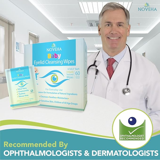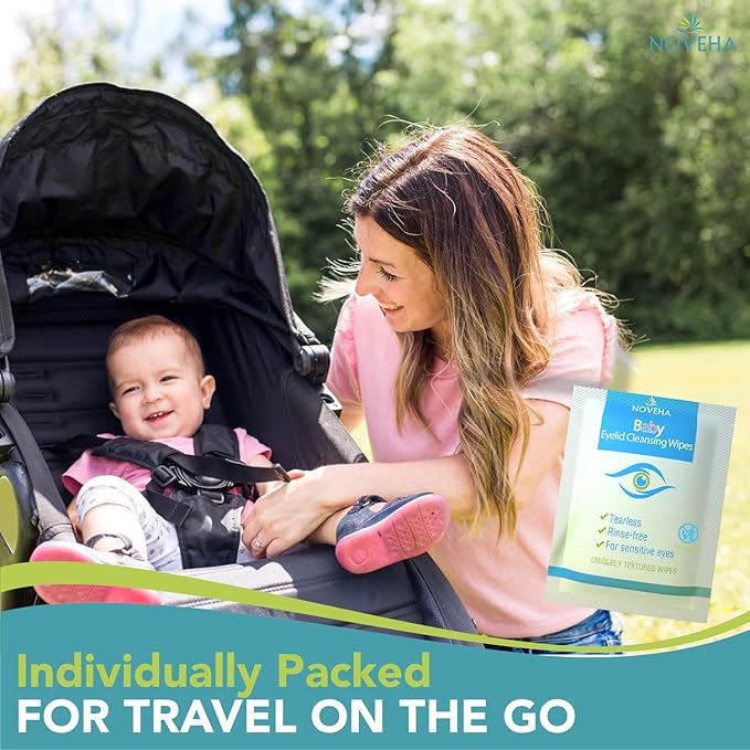 NOVEHA 60PCs Baby Eye Wipes | Safe & Natural Eyelid & Lash Wipes | Non Irritating, Tear Free, Hypoallergenic & Preservative free | Organic Baby Wipes for Sensitive Skin | Soothing and Moisturizing