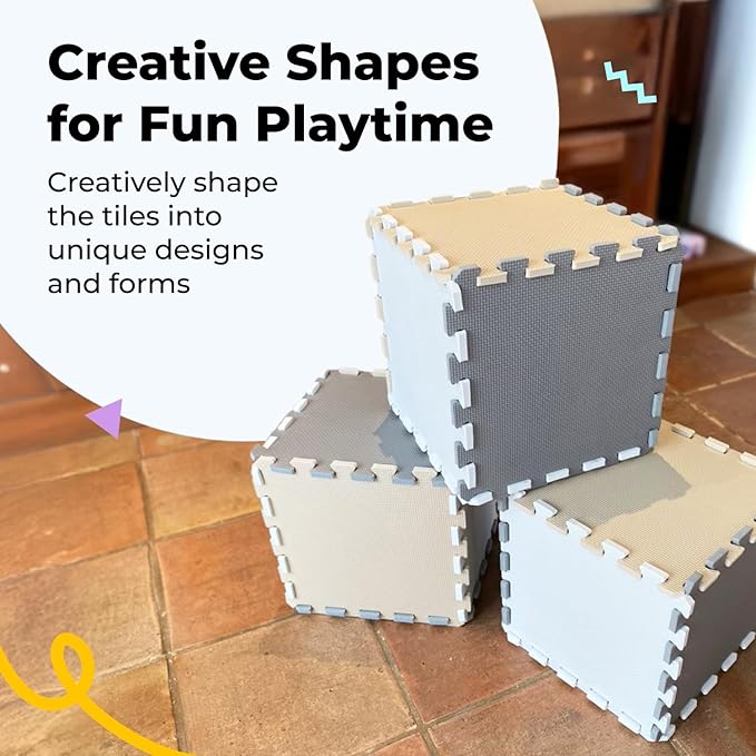 - 😊 STYLISH & ADJUSTABLE PUZZLE MAT – With chic, modern colors, the MioTetto foam floor tiles blend seamlessly into nurseries, playrooms, or living spaces. This baby play mats for floor is perfect for as a 50x50 playpen mat and 74x74 playpen mat. Unlike mats with fixed sizes, this baby mat for floor adapts perfectly to any area — simply add or remove tiles to fit your space.