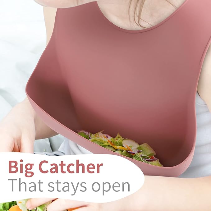 - 3D FOOD CATCHER POCKET DESIGN: Our silicone bib is waterproof and has a large 3D pocket, it is always open to catch the falling food out of baby’s mouth. Don't worry the food will stain clothes and spill on high chairs and floor