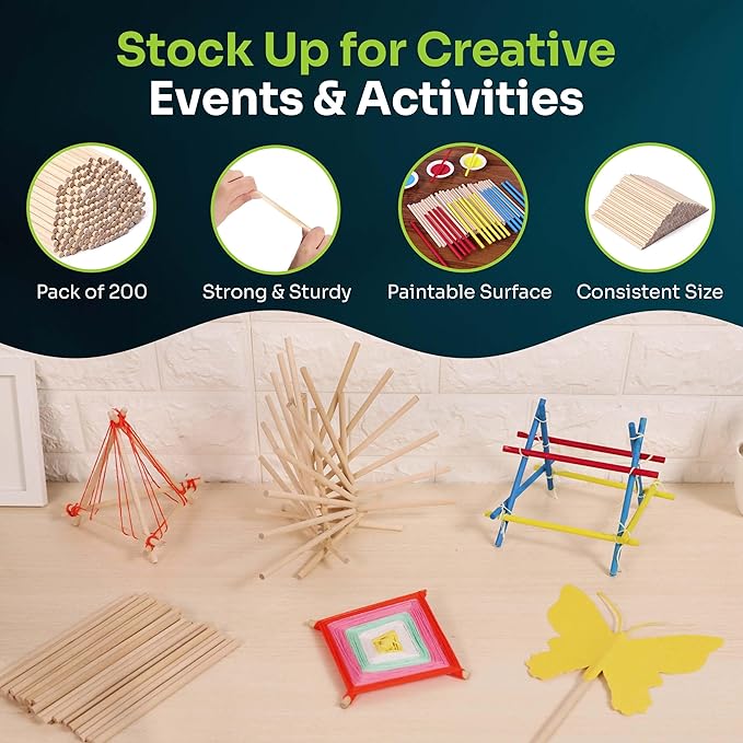 - SMOOTH WOODEN STICKS FOR CRAFTS: The plastic bag contains 200 pencil sized wooden rods, 1/4 inch x 6 inch (6.35 cm x 15.25 cm), 6 inch dowel rods that are made for assorted art & craft projects. They are round, sturdy and do not break easily.