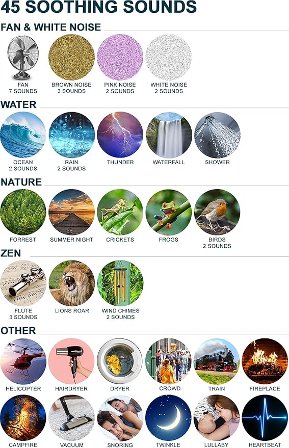 - 45 SOOTHING SOUNDS - 7 fan, 3 brown noise, 2 pink noise, 2 white noise, twinkle, lullaby, heartbeat, 2 ocean, 2 rain, thunder, shower, waterfall, forest, summer night, crickets, frogs, 2 bird, helicopter, hairdryer, dryer, crowd, train, fireplace, campfire, vacuum, snoring, 3 flute, lions roar, and 2 wind chimes.
