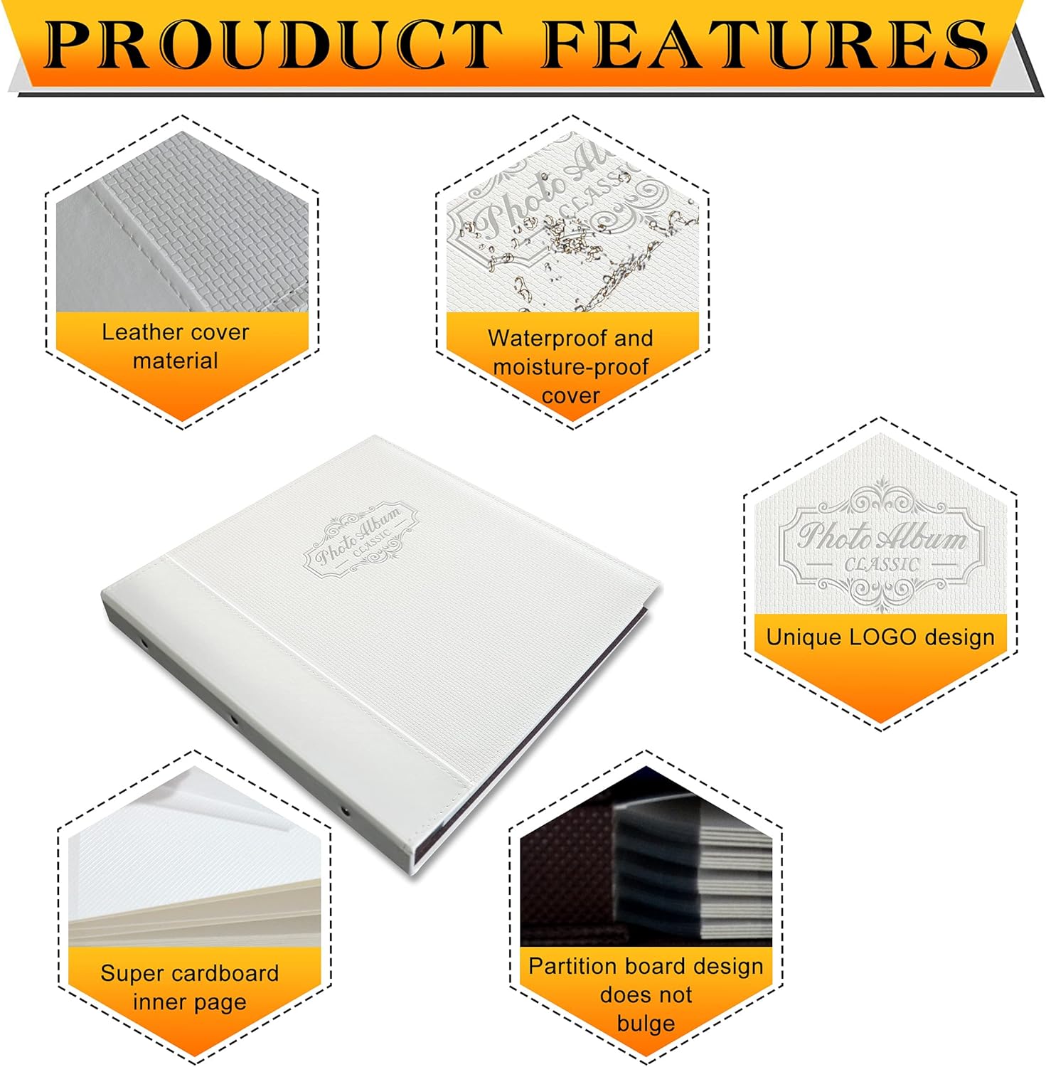 Photo Album Holds 3X5, 4X6, 5X7, 6X8, 8X10 Photos, Leather Cover, Magnetic Self-Stick Page, Hand Made DIY Albums (White, Large)