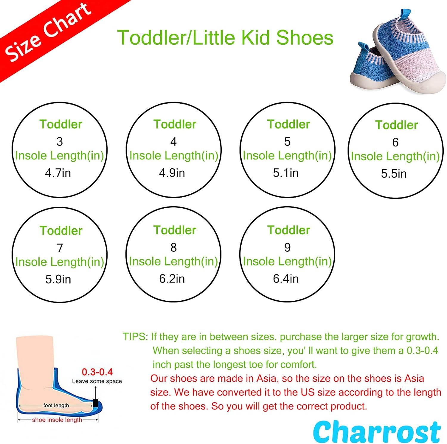 - We recommend you choose a insole length that is about 0.2-0.4 inches longer than your baby's feet. If your baby's feet are thinner, we recommend you choose a insole length that is about 0.1-0.2 in longer than the baby's feet. To ensure the size is correct we politely ask you to measure your baby's feet before purchasing. Our shoes are made in Asia, so the size on the shoes is Asia size. We have converted it to the US size according to the length of the shoes. So you will get the correct product