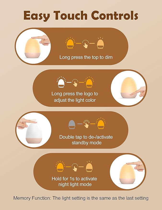 - [Touch Light]: One-click to turn the baby night light on or off. Long press to adjust the brightness, making it convenient for nighttime feeding and diaper changing. Double-click the logo to set a 1-hour timer for automatic shutdown.