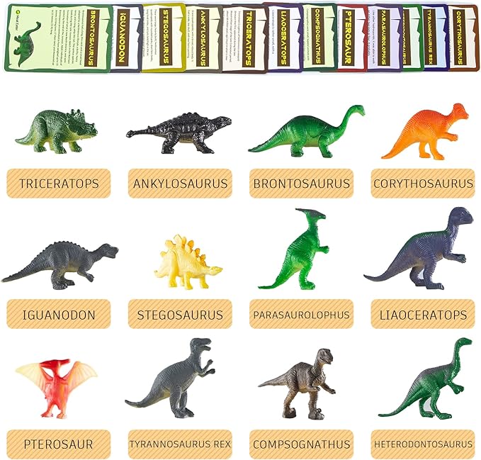 - 1.What will I get? Our dino egg excavation kit contains a big dino egg over 6" tall with 12 different small dinosaur toys inside to dig out ,two chisels, hammers and brushes. And 12 full color dinosaur learning cards with information on each dinosaur and a picture reference sheet to match toys to the name cards, 1 dice, 1 dinosaur flying chess for play and competition