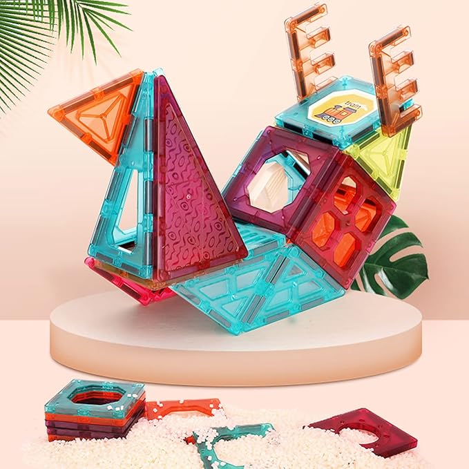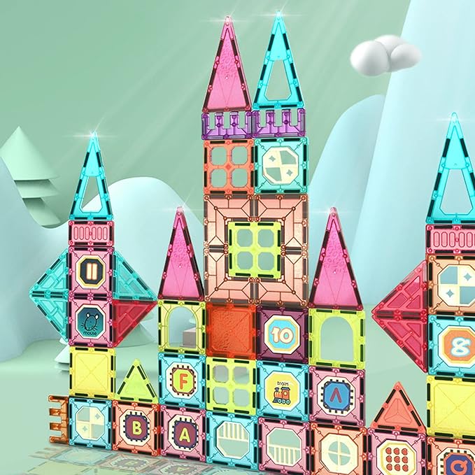 - đ°ăMagnet Building Block Set with 4 car basesă: Includes various geometric shapes tiles including Square, Triangle, Roof, Staircase and 4 Car Bases. Among them, some are traditional clear colors, some have hollow windows, and others are embedded with educational graphics card boards (simply poke the board to make it rotate). Double magnetic stripes fixed in each edge provide super strong magnets and guarantee sturdiness for tall structures.