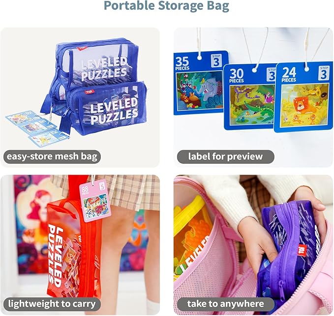 - 👍 [LEVELED PUZZLES] The jigsaw puzzles are designed as seven steps for kids aged 2-8. The difficulty and educational awareness of our kids puzzles increase gradually with steps, including puzzle pieces. You can always find the right one for kids of their age.