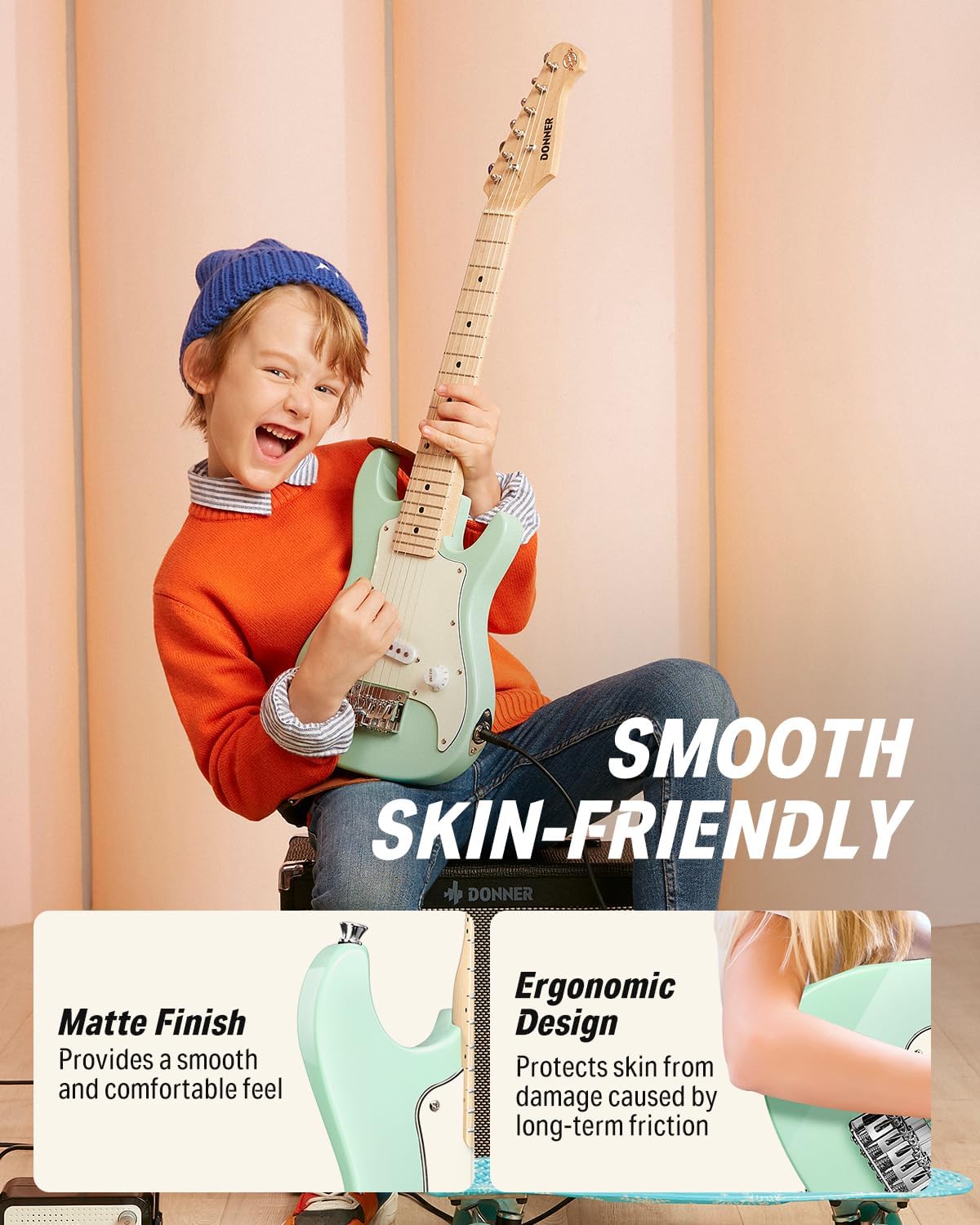 - 【Protect Skin with Exquisite Craftsmanship】: The mini electric guitar's ergonomic design protects skin from damage caused by long-term friction against the inner forearm. The matte lacquer surface helps reduce friction allowing children to play all day without discomfort