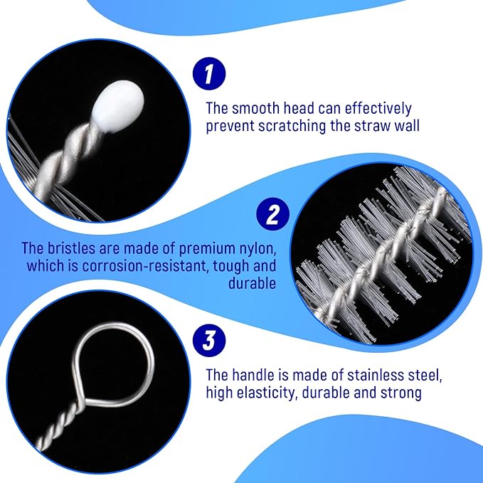 - 【Premium Material】This straw cleaner brush is made of food-grade 304 stainless steel, which is not easy to deform when it meets water, high elasticity, no rust and no skid. The bristles are made of high-density environment-friendly nylon, which is corrosion-resistant, durable, tough and durable.