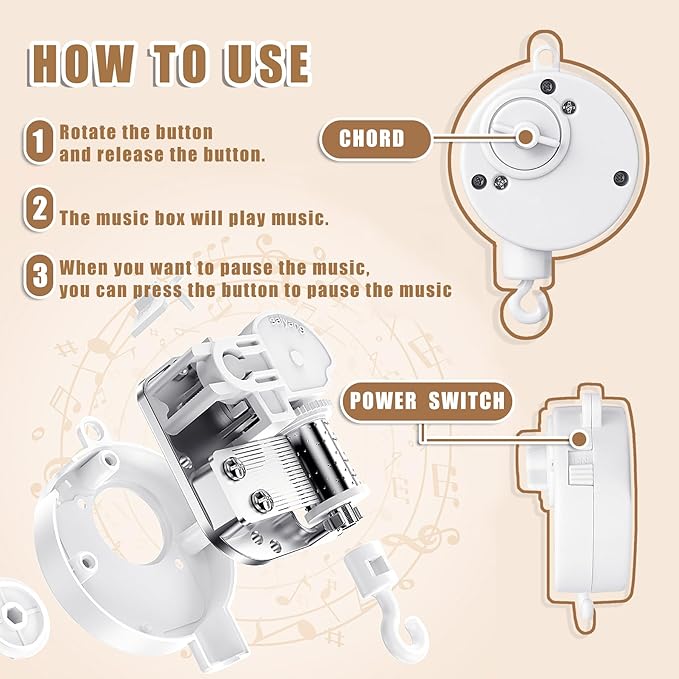 - 【Help fall asleep】:Wind-up Music Box with light music help your baby easier fall asleep. Fits traditional and convertible cribs.No need screws and more convenient to carry.