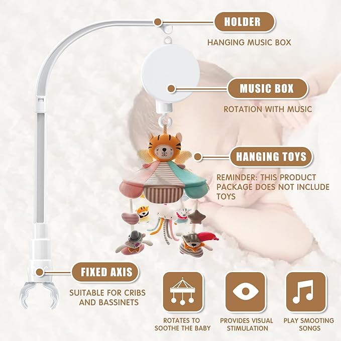 - 【Easy to install】:Splice each pieces [very easy to operate], you'll get one brand-new stable baby crib mobile with holder arm bracket and wind-up musical box, DIY devices are more convenient to carry,Dolls are not included .
