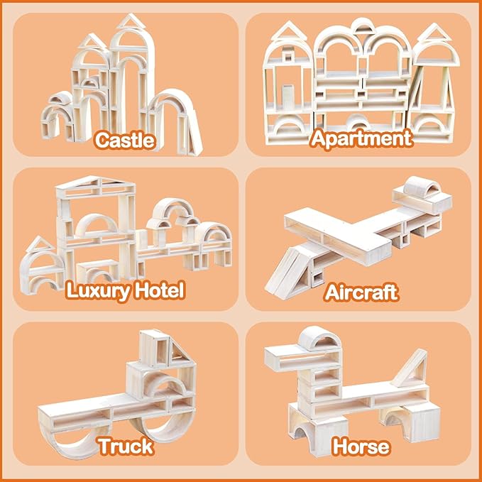 - 【Durable Hardwood Solid Structure and Safe Materials】 Made from selected solid rubber wood, unpainted blocks are crafted with rounded corners and edges to keep children safe. All the edges are sanded smoothly, and the joints are reinforced with screws for longevity. Conforms to US Toy Standard, test approved!