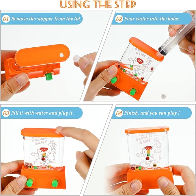 - Package includes: comes with 10 pieces handheld water games in different styles, the product does not contain water, you can open the stopper on the product, add water to it, and start the game, the colors are randomly chose from orange, yellow and green, bright colors and enough quantity can meet your needs or you can share with friends and play together