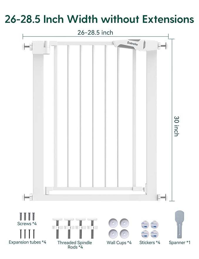 - HEIGHT & APPROPRIATE WIDE: 30 Inch height & 26-28.5 Inch width, suitable for installation at the narrow doorway, hallway, stairway. The narrow baby gate is made of all-steel structure, it can withstand impacts from pets