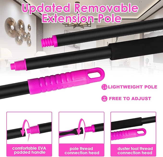- [ Pole (1-7.8ft) 15ft Max Reach]: Lightweight yet sturdy 7-section pole extends from 1ft to 7.8ft (13-93in). With the addition of man and duster accessories, the height can reach 84-180in/7-15ft. It's easy to clean high-wall, curtain rail, and cobweb cleaning