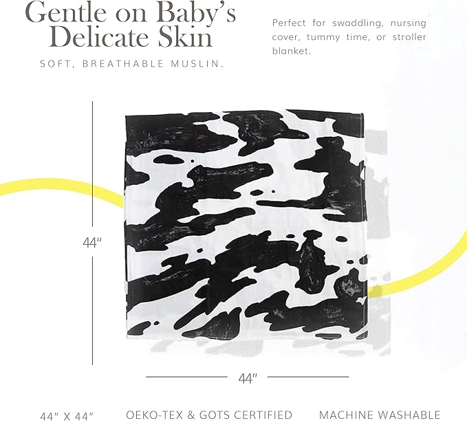 RED ROVR 100% Organic Cotton Muslin Swaddle | Newborn Receiving Blanket | Baby Wrap | Boy, Girl, Unisex | Soft, Lightweight, Breathable | Burping, Nursing, Swaddling | 44" x 44" | Moo Cow
