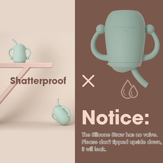 - LEAKPROOF, SHATTERPROOF: The liquid won't come out through the lid, it can keep the damage to a minimum and keep your child’s clothes and the floor nice and clean. The silicone training cup is shatterproof as well, it won't break when dropped