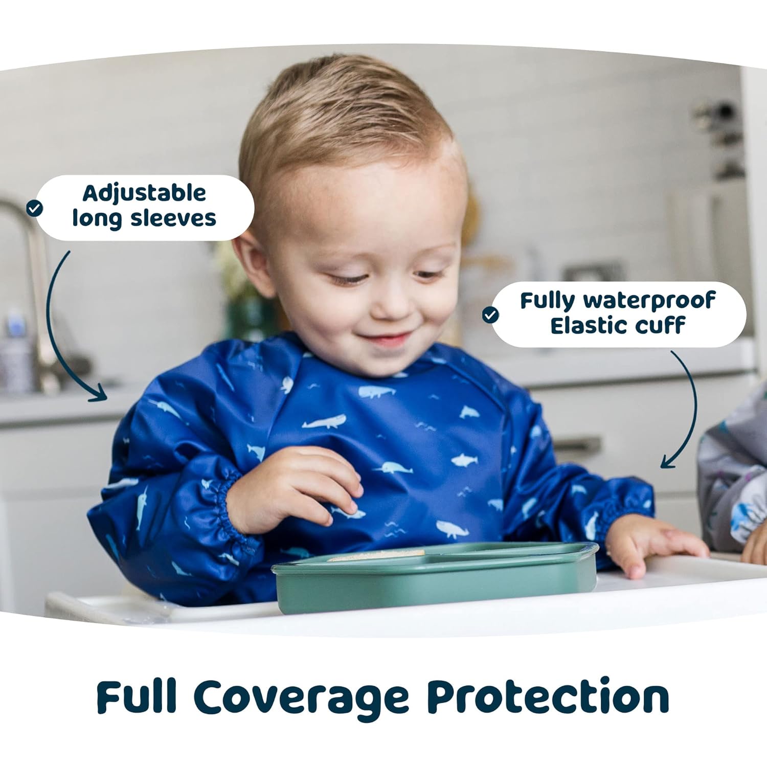 - BABY ESSENTIALS MUST HAVES: Few items are more crucial than waterproof smock baby bibs. Made from 100% recycled polyester with a waterproof back coating, these bibs block stains and catch spills with their spill-proof pocket. Machine-washable and quick-drying, they are perfect for baby-led weaning and everyday use. Whether you need baby bibs for eating or long sleeve bibs for weaning, these are a must-have for any parent!