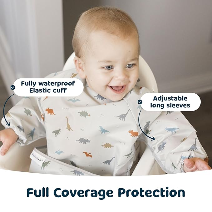 Tiny Twinkle Long Sleeve Bib for Babies & Toddlers – Waterproof Smock Bib for Eating – Machine Washable & Mess-Proof, Baby Feeding Essential & Shower Must-Have(Dinosaur, 6–24M)