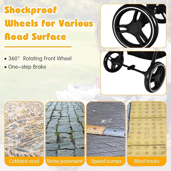 - High Security Design: Our baby stroller features a 5-point safety harness and a removable bumper bar, which can protect your baby from sliding out of the bassinet. Besides, 2 front universal wheels with spring suspension system can easily adapt to various road surfaces. The rear wheels with one-step lock ensure safety.