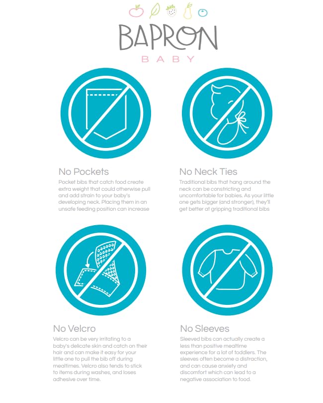 - RECOMMENDED BY PEDIATRIC FEEDING EXPERT: Baprons come highly recommended by pediatric feeding experts. Our unique design ties around the body, prioritizing safety and comfort for infants and toddlers. Baprons are intentionally pocket-less, eliminating extra weight that could otherwise pull on your baby's neck and cause potential neck injury or skin irritation. Baprons are safe for sensitive skin, children who dislike traditional bibs and/or have hypersensitivity to sensory stimuli.