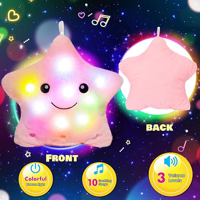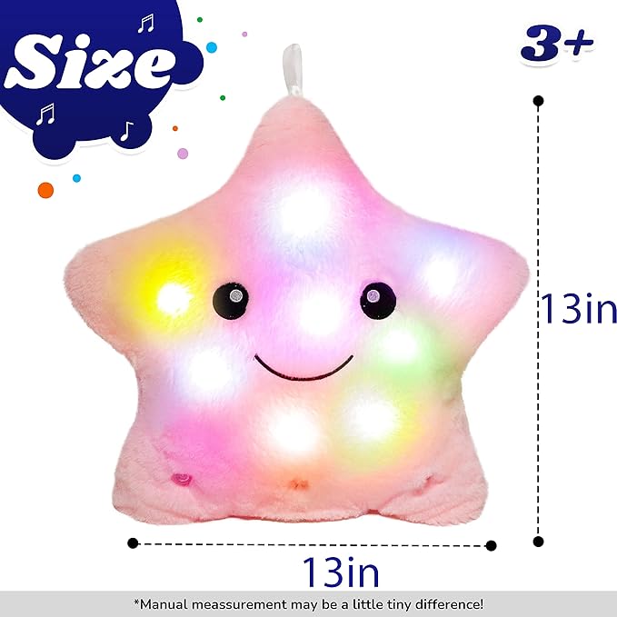 - STAR PILLOW SINGS: This soft LED musical star can sing! When you press the button on the right, it will change the song! All these soft songs can soothe children's mind and accompany them to dreamland.