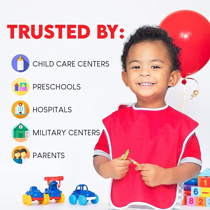 • EXTRA WIDE COVERAGE KEEPS SPILLS OFF - Because even though there is no pocket, Toppy Toddler bibs are longer and wider than most. So clothes stay clean. Although some bibs have pockets, most of the time food still finds its way to the floor or lap area. And as good as crumb catchers are, this bib gives you 20 percent more coverage with an impressive 13" x 18" surface area. Almost 12" from the neck down. That's 235 square inches of total protection extending to the lap area too.