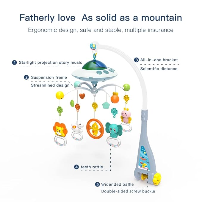 - Safe Crib Toy - Crib mobile is made of safe ABS material, BPA free. The crib mobile is designed to be as safe and stable as a fatherly love. Its bracket spacing science. Its suspension frame has a streamlined design. The baffle is widened and double-sided turnbuckles can prevent slipping and falling off. These provide a variety of insurances for the safety of the baby.