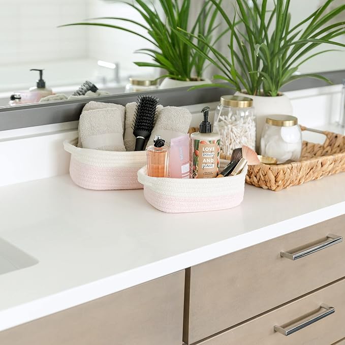 - 5 BASKETS FOR 5X THE ORGANIZING POWER: Life is messy...but your house doesn’t have to be! With 5 beautiful rope baskets for organizing, you’ll defeat messy rooms like a true supermom! Use the largest baskets for Montessori displays or countertop fruits holder, create the cutest dog toy storage or bathroom hand towel holder with the medium ones and stash jewelry or keys in the smallest. Biggest (11.8"x8.7"x4.3"), (11"x7.9"x3.9"), (10.2"x7.1"x3.5"), (9.1"x6.3"x3.1"), Smallest (7.9x5.5"x2.8")