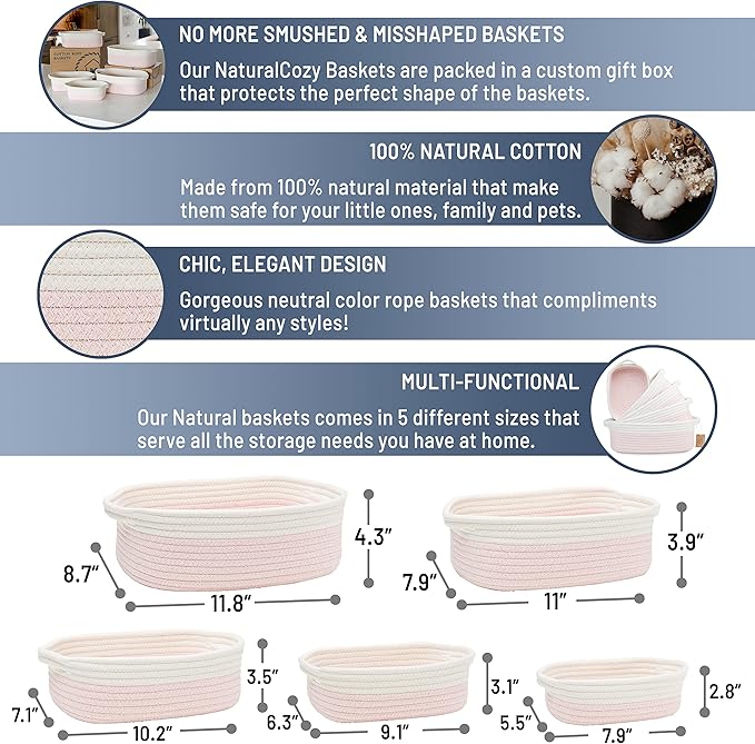 NaturalCozy 5-Piece Rectangle Storage Basket Set- Natural Cotton Rope Woven Baskets for Organizing! Small Basket for Montessori, Baby Nursery, Dog Toy Baskets, Cat Toy Box, Bathroom Organization Bin