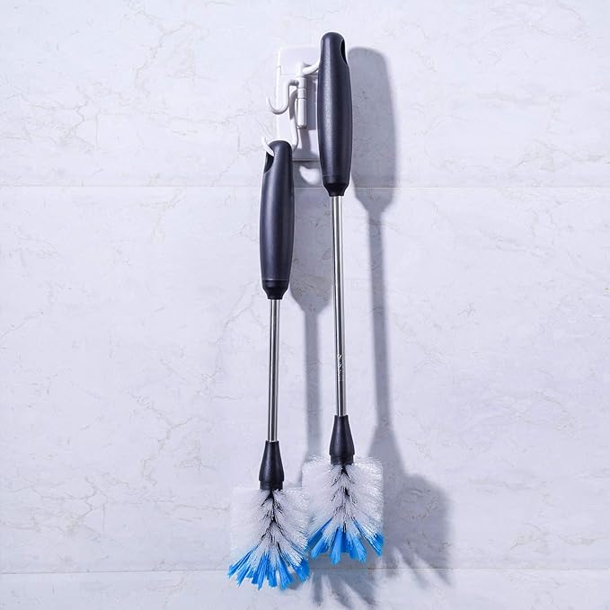 - Dual-Function Bristles: Brush head has two types of bristles for gentle cleaning and serious scrubbing; soft white bristles are gentle enough to wine glasses and crystal without scratching, while the stiff blue bristles on the tip are firmer, give the hard-to-reach corners and bottom of bottles a serious scrub