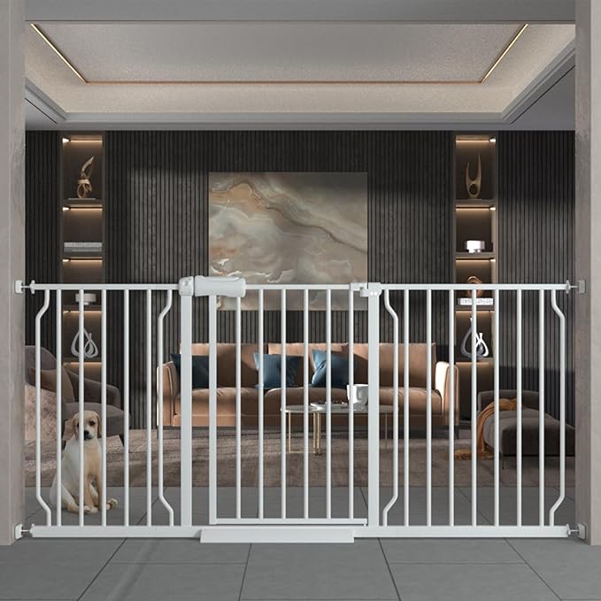 - 【GREAT FOR MOST OPENINGS】Our white Extra Wide Baby Gate is suitable for different doors! Choose for openings between 62-67 Inch. We have different baby gates sizes,it doesn't include all extensions,the extension which you received denpends on your door opening.Whether your dooway is wide or narrow ,you can find the suitable baby gate or pet gate.And our large walk thru gate makes it easier to walk when holding the baby.