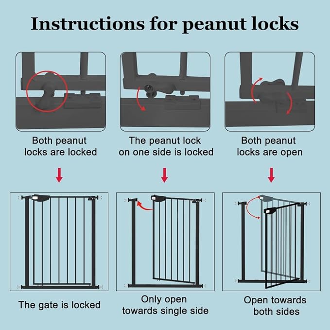 - 【Multiple modes】 Our triple lock gate has various statuses to meet your multiple needs in life. When all three locks are locked, little babies or pets will be stopped by it. At the bottom , there are two peanut locks to control the opening direction and locking. If the peanut lock on one side is locked, the gate can only be opened towards single side. If both peanut locks are open, the gate can swing both ways. Besides, it will stay open at 90 degrees and auto-close when it's less than that.