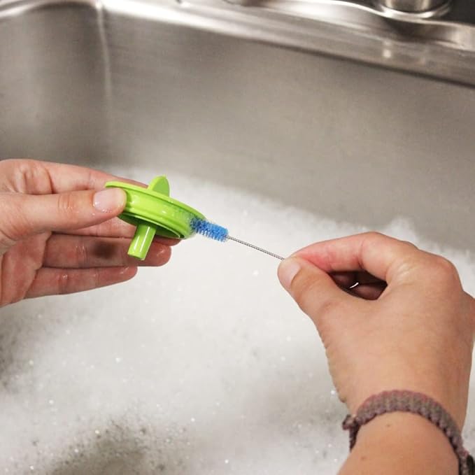 - Grooved no-slip handle for easy grip. Chevron channels at base for cleaning nipples. Storage clip to house brush near the sink.