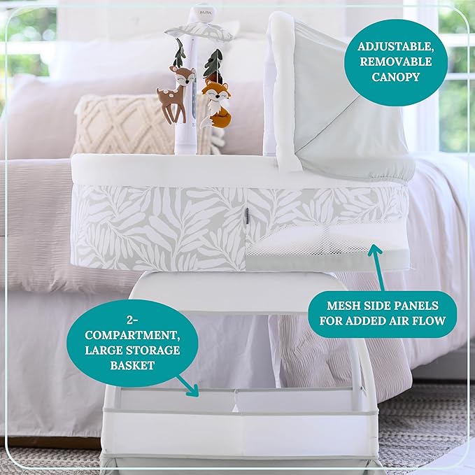 Baby Sweetli Calm Infant Bassinet Bedside Crib Sleeper with Cry Recognition, Electric Mobile with Deluxe Toys, Music, Nightlights, Vibration (Wheat Melange)