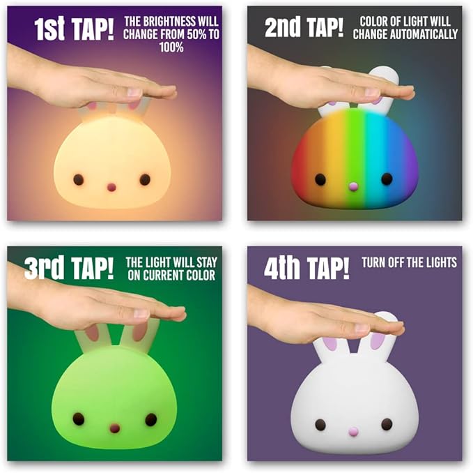 - ✅ EASY CONTROL – Our bunny light has easy on/off button for you to turn the light on/off at any time, you can also tap the light to change its color or brightness. This cute Bunny night light has 16 light color build in, they are soft at the night and easy on the eyes. Tap the bunny night light to switch between warm light mode or 16 color rotating mode, you can fix on any color you like. Aultra kids night lights are incredibly durable and easy for kids to use at playtime or bedtime.