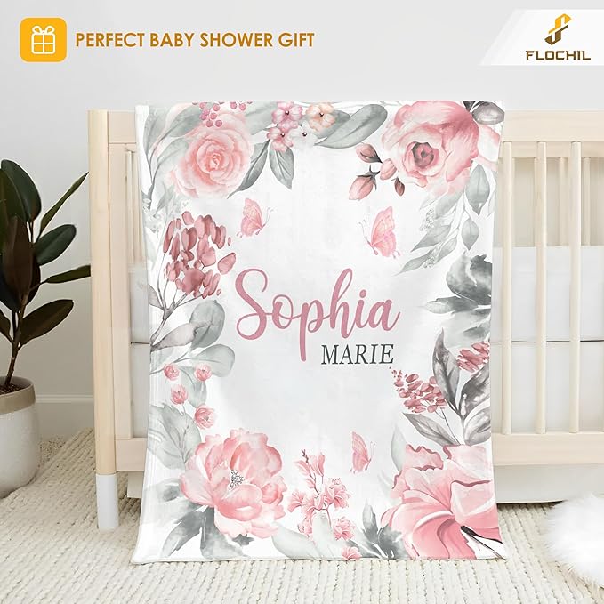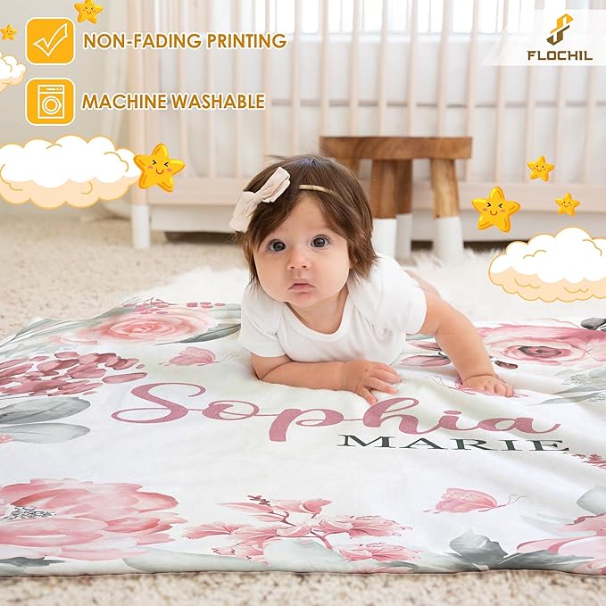 FLOCHIL Personalized Baby Blankets, Custom Baby Blanket - Baby Blanket with Name for Girls, Best Gift for Baby, Newborn Floral Plush Fleece (30x40)