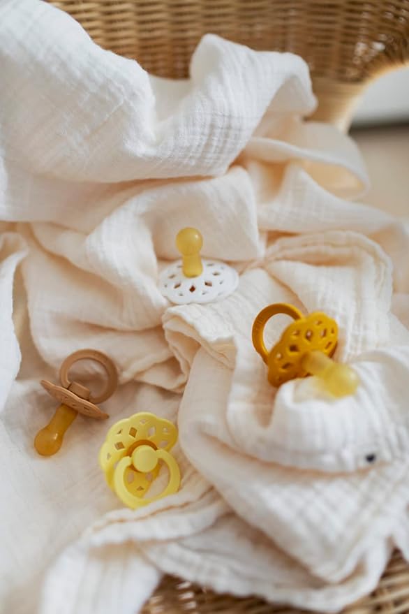 - 𝗖𝗔𝗥𝗘 𝗜𝗡𝗦𝗧𝗥𝗨𝗖𝗧𝗜𝗢𝗡𝗦: Sterilize each pacifier before use by pouring boiling water over it, squeezing any remaining water out, and letting dry for 4–6 hours. We recommend a replacement every 4-6 weeks for both safety and hygienic reasons. Rubber latex is a natural material and is affected by sunlight, high temperatures, and moisture. If you experience a change in the material, the pacifier must be replaced.